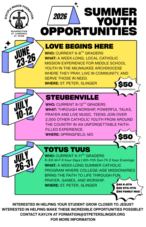 sending a check payable to St. Peter, or online using WeShare. Be sure to scroll down and use the Faith Formation Fees option.